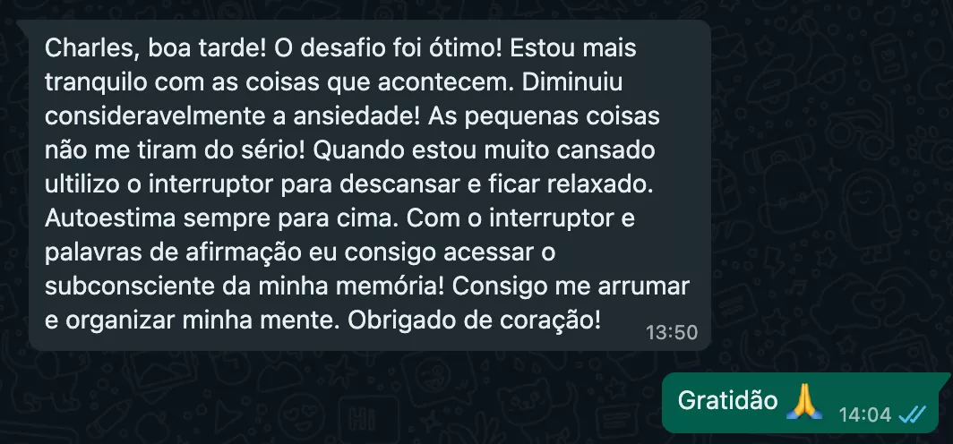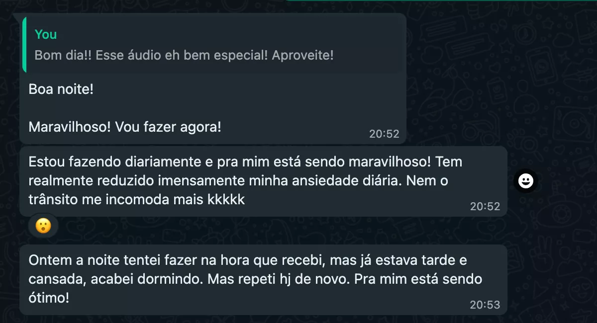 “Quero agradecer muito pelos áudios e por todo o suporte. Como já comentei antes, eles realmente me ajudaram bastante. Senti uma grande diferença na redução da minha ansiedade e percebo que estou muito mais calma diante de situações que antes me deixavam nervosa ou angustiada. Isso tem sido ainda mais valioso agora, nesse momento de fim de ano. Só tenho a agradecer por essa jornada incrível e transformadora. Muito obrigada por tudo! Desejo uma ótima semana para você. Um grande abraço!”